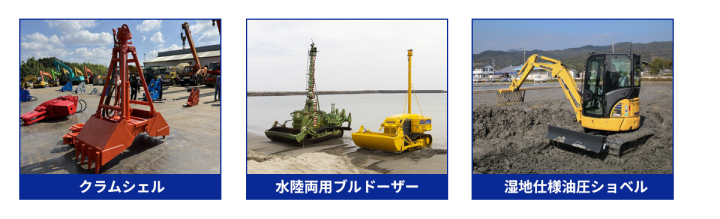 水陸両用ブルドーザーは、浅い水域で稼働できる特殊なブルドーザーです。通常のブルドーザーと同様に土砂を押し均す機能を持ちながら、浮力装置や特殊なクローラーを備えています。 - 湿地仕様油圧ショベル